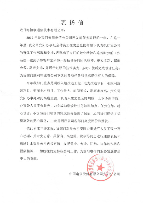 轉(zhuǎn)發(fā)“中國電信股份有限公司安陽分公司”對我公司員工的一封表揚信